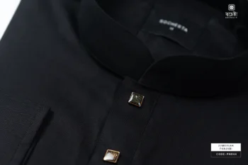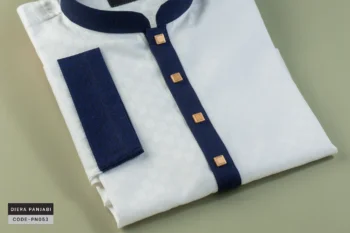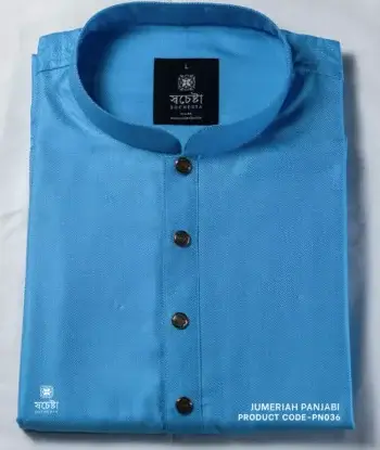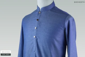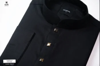 An elegant black Panjabi with a refined silhouette. Features a blue floral collar that adds a graceful touch. Golden buttons highlight its regal detailing. Perfect for festive evenings and cultural gatherings. A timeless blend of tradition and modern style.
