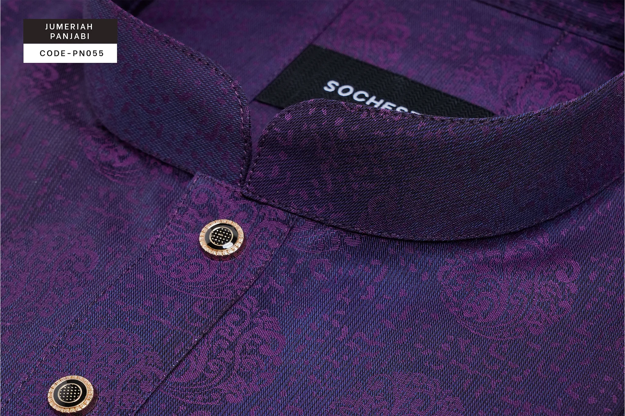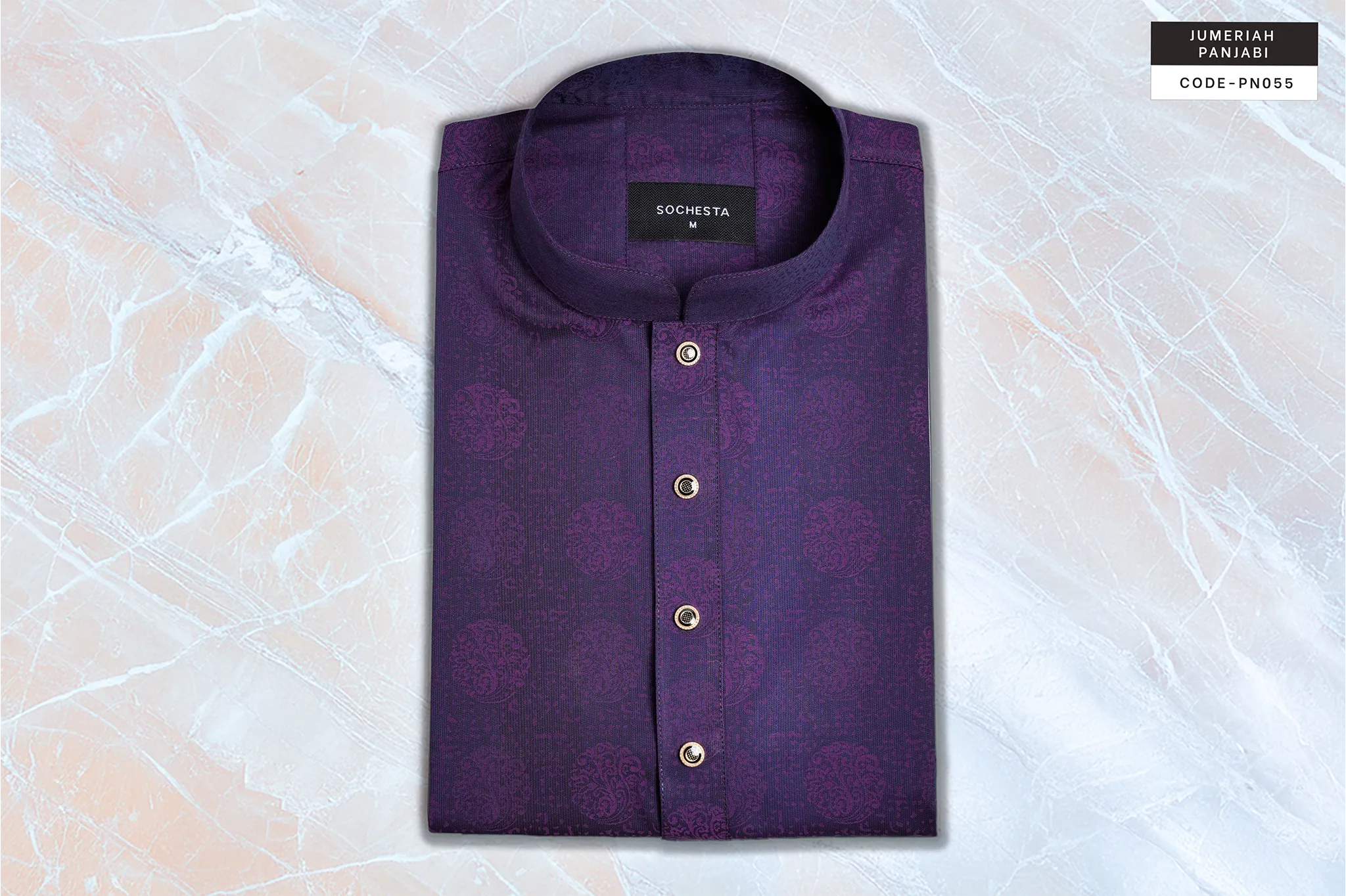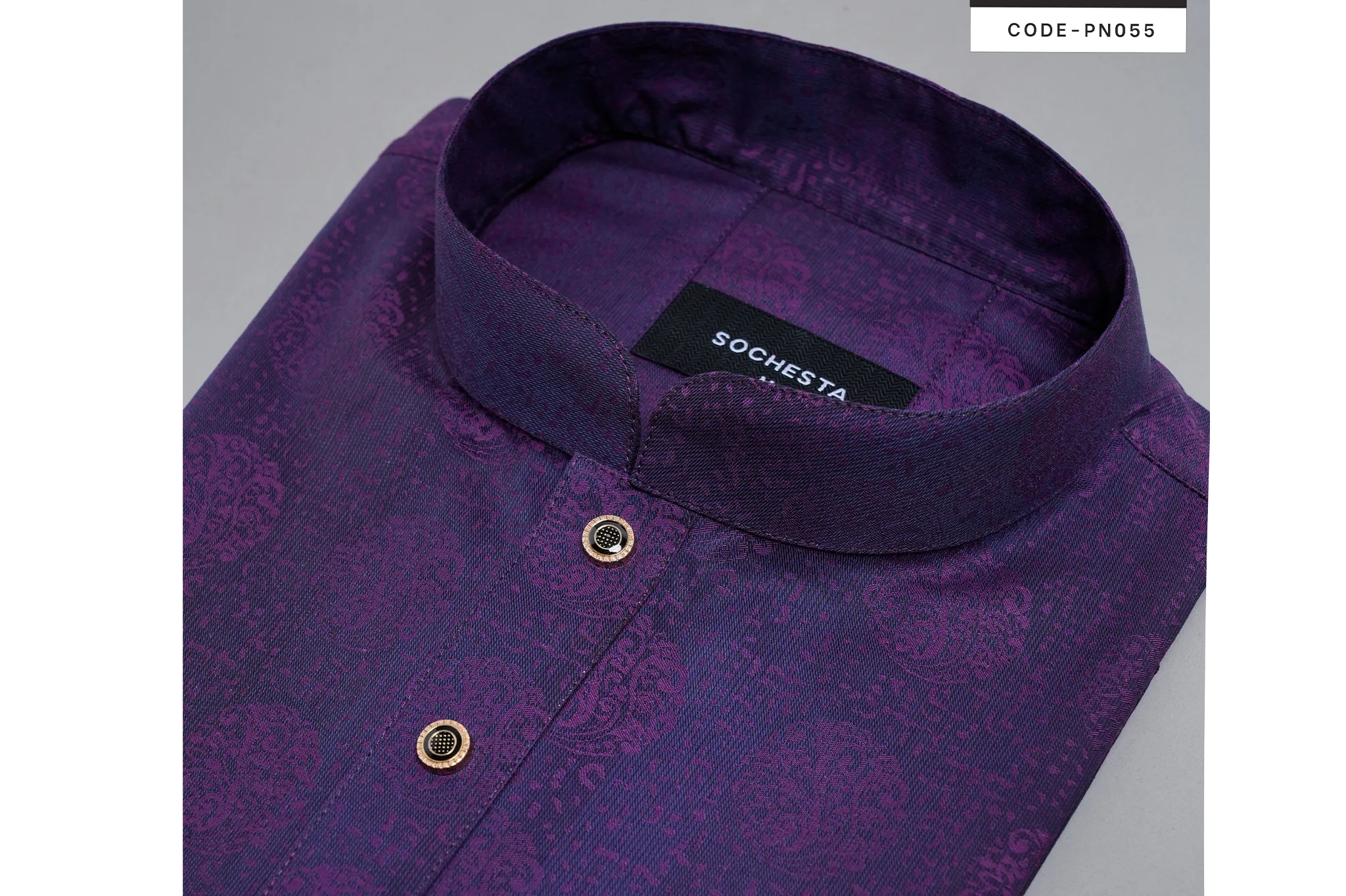 Elevate your festive wardrobe with the refined elegance of the Jumeriah Panjabi (PN055). Crafted in a rich royal purple hue, this panjabi features an intricate woven paisley pattern that adds depth, texture, and timeless sophistication to your look. Designed with a classic band collar and a sleek buttoned placket, it is accented with premium metallic buttons for a polished finish. The tailored silhouette ensures a sharp yet comfortable fit, making it perfect for weddings, Eid celebrations, cultural events, or evening gatherings.